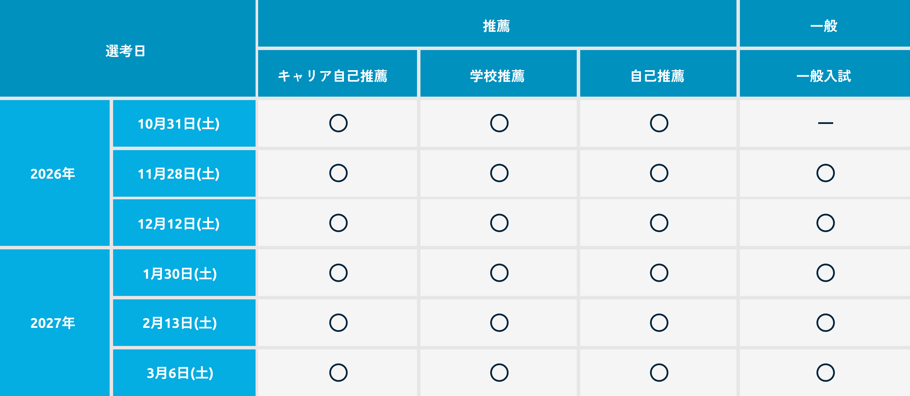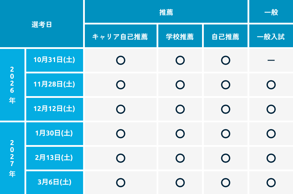 キャリア自己推薦、学校推薦、自己推薦の選考日は、2024年10月19日(土)、11月30日(土)、12月14日(土)、2025年1月25日(土)、2月15日(土)、3月8日(土)