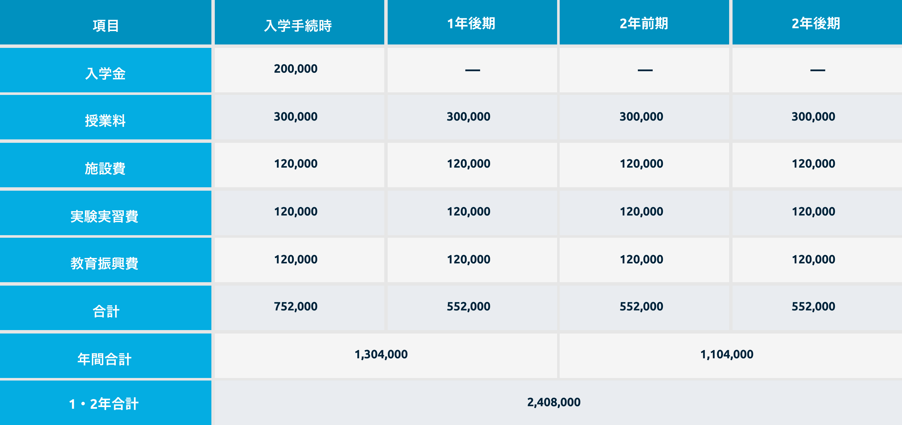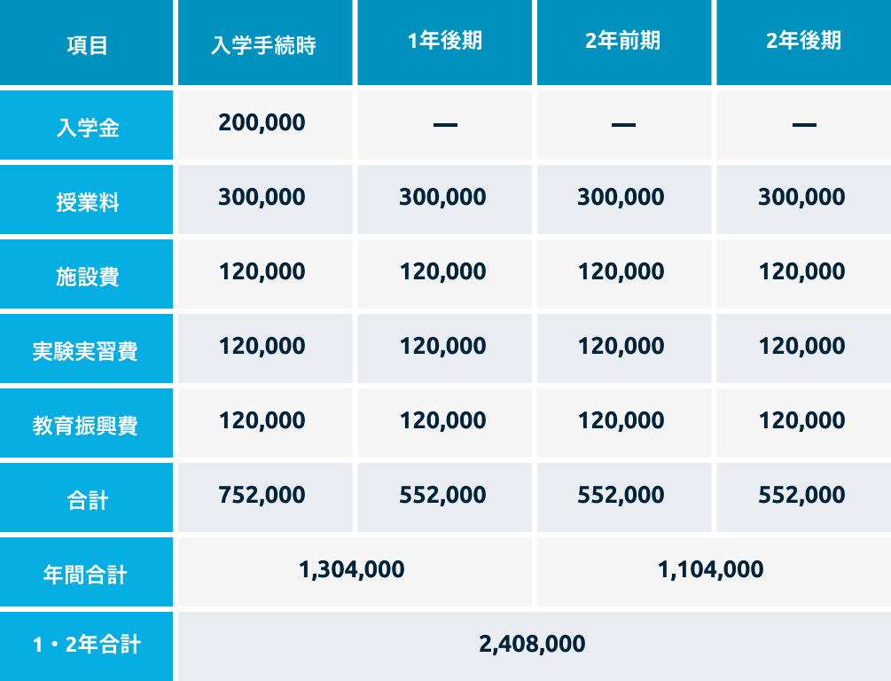 入学手続き時には、入学金が20万円、授業料が30万円、施設費が12万円、実験実習費が12万円、教育振興費が12万円で、合計75万2千円。 1年後期には、授業料が30万円、施設費が12万円、実験実習費が12万円、教育振興費が12万円で、合計55万2千円。 1年時の年間合計は、130万4千円 2年前期には、授業料が30万円、施設費が12万円、実験実習費が12万円、教育振興費が12万円で、合計75万2千円。 1年後期には、授業料が30万円、施設費が12万円、実験実習費が12万円、教育振興費が12万円で、合計55万2千円。 2年時の年間合計は、110万4千円 1、2年の合計は、240万8千円