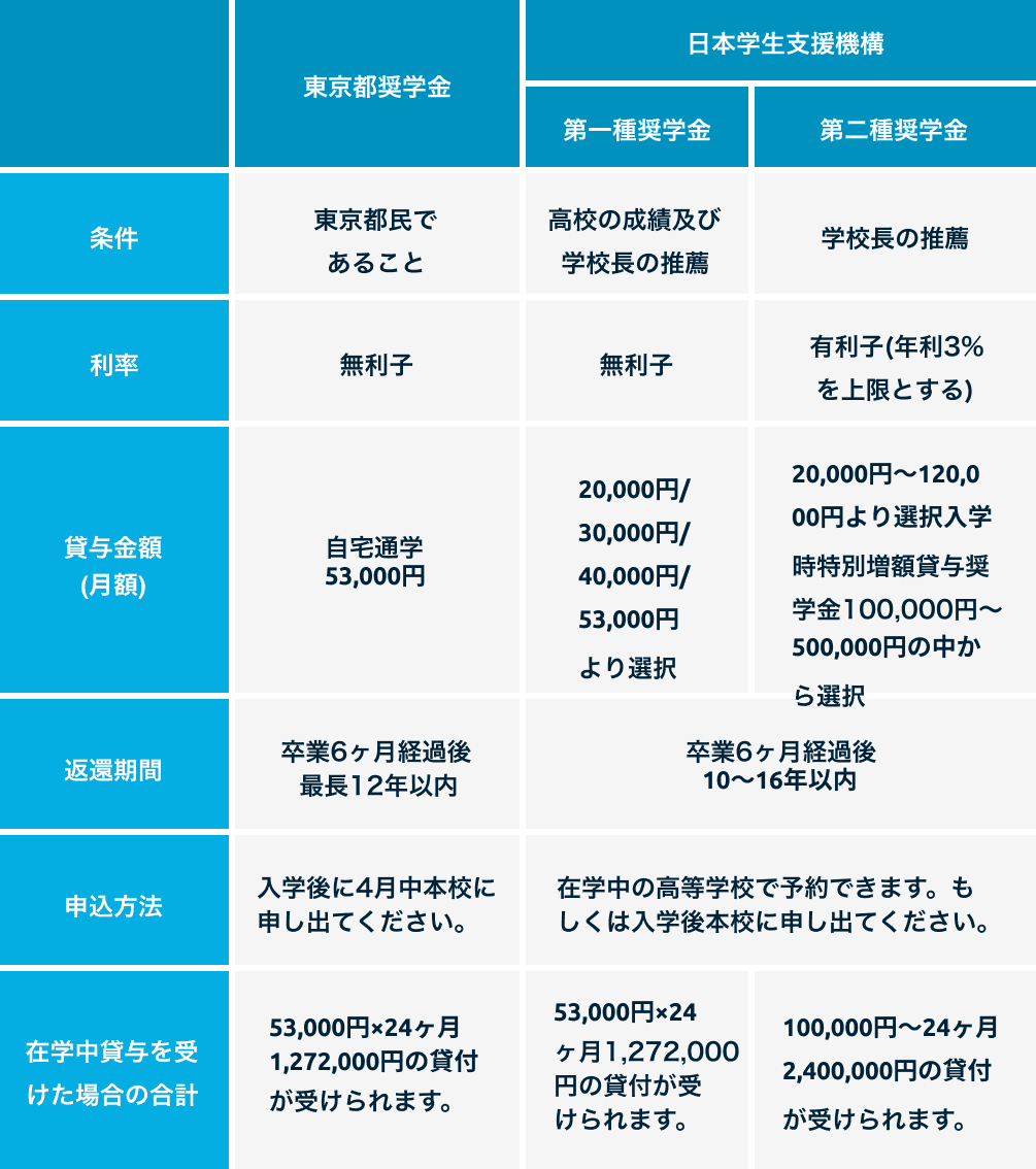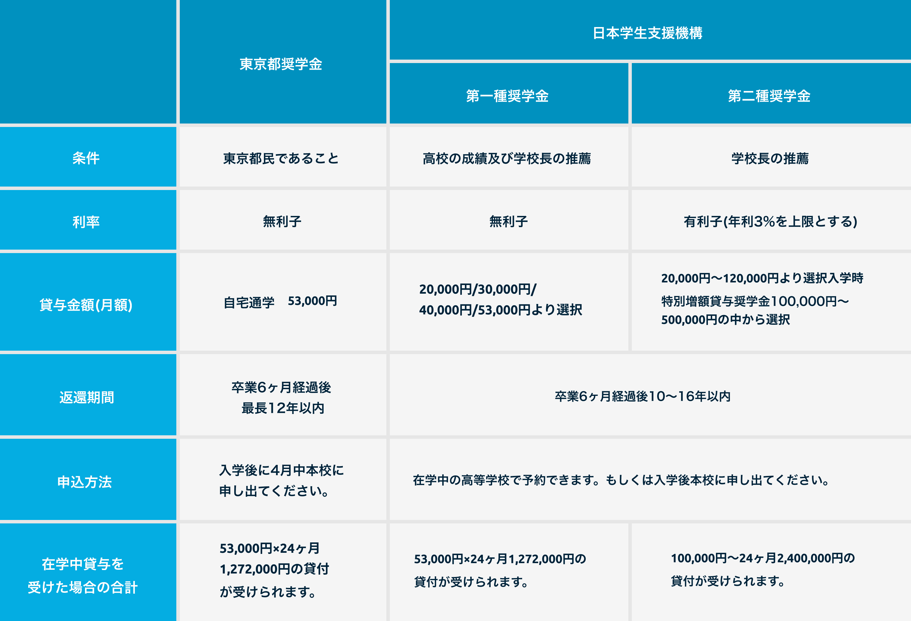 東京都奨学金の場合、条件は東京都民であること。利率は無利子。月額の貸与金額は、自宅通学53,000円。返還期間は、卒業6ヶ月経過後最長12年以内。申込方法は、入学後に4月中本校に申し出てください。在学中貸与を受けた場合の合計金額は、53,000円×24ヶ月で1,272,000円の貸付が受けられます。 日本学生支援機構の第一種奨学金の場合、条件は高校の成績及び学校長の推薦があること。利率は無利子。月額の貸与金額は、20,000円、30,000円、40,000円、53,000円より選択。返還期間は、卒業6ヶ月経過後10〜16年以内。申込方法は、在学中の高等学校で予約できます。もしくは入学後本校に申し出てください。在学中貸与を受けた場合の合計金額は、53,000円×24ヶ月で1,272,000円の貸付が受けられます。 日本学生支援機構の第二種奨学金の場合、条件は学校長の推薦があること。利率は有利子(年利3%を上限とする)。月額の貸与金額は、20,000円〜120,000円より選択。入学時特別増額貸与奨学金100,000円〜500,000円の中から選択。返還期間は、卒業6ヶ月経過後10〜16年以内。申込方法は、在学中の高等学校で予約できます。もしくは入学後本校に申し出てください。在学中貸与を受けた場合の合計金額は、100,000円〜24ヶ月2,400,000円の貸付が受けられます。