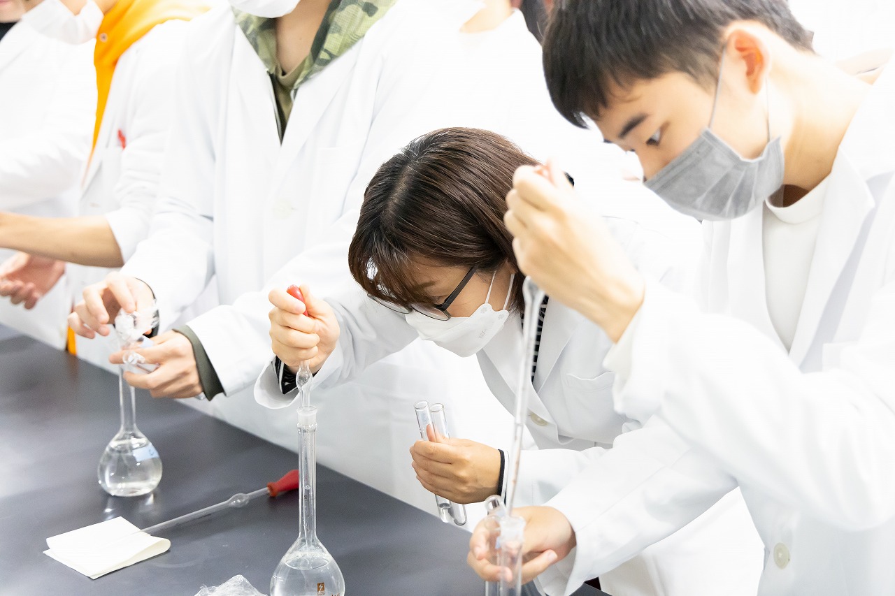 この日の授業は「糖の定性反応」実験! 5種類のデンプンに、薬品を入れて温めて、変色反応や沈殿物をチェックします。